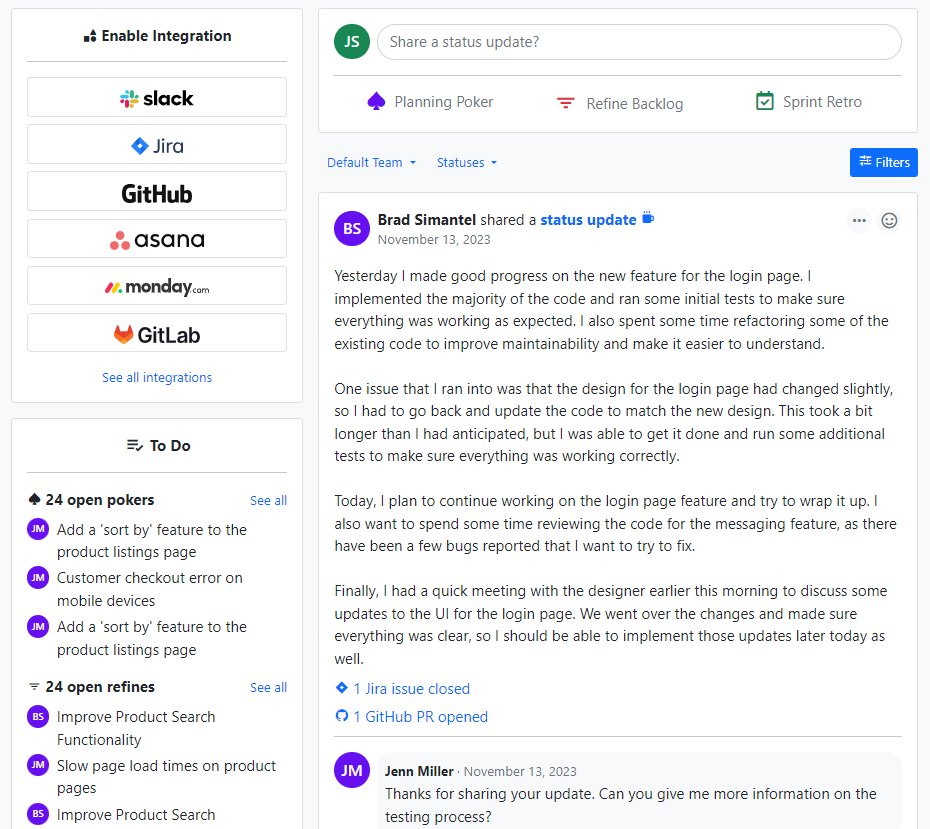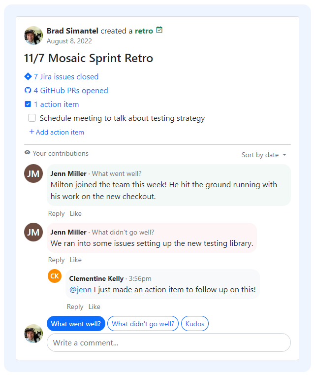 We also display important metrics (Jira issues closed, GitHub PRs opened, etc.) along with async retros to give your team a holistic view of their work and impact. This not only helps teams to track their progress, but also fosters a culture of transparency and accountability.