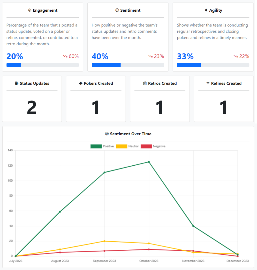 To give an example, Teaminal draws data on team sentiment and engagement from our Agile meeting features. Our platform them transforms this data into a range of useful dashboards, reports, and charts that you can use to visualize trends, spot potential issues, and make data-driven decisions.