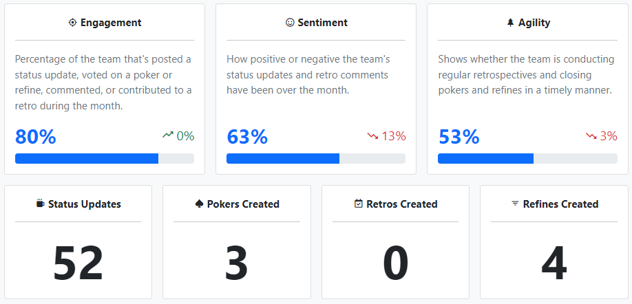 Our sentiment report pulls data from retrospectives (more on those in a minute) to give you a sprint-by-sprint breakdown of your team’s attitude and morale. You can use this data to provide better coaching and mentorship as necessary, as well as uncover areas for improvement in process or communication.