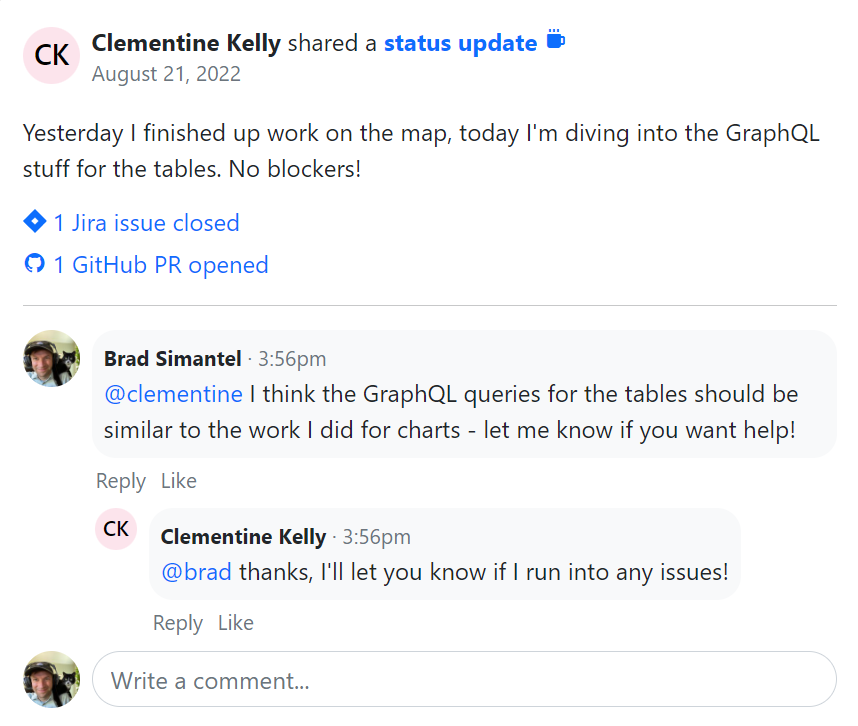 - To facilitate recalling the sprint’s activities, your progress updates are displayed in a sidebar, while the closed Jira issues/GitHub PRs (or similar data from other integrations) worked on by the entire team are listed.