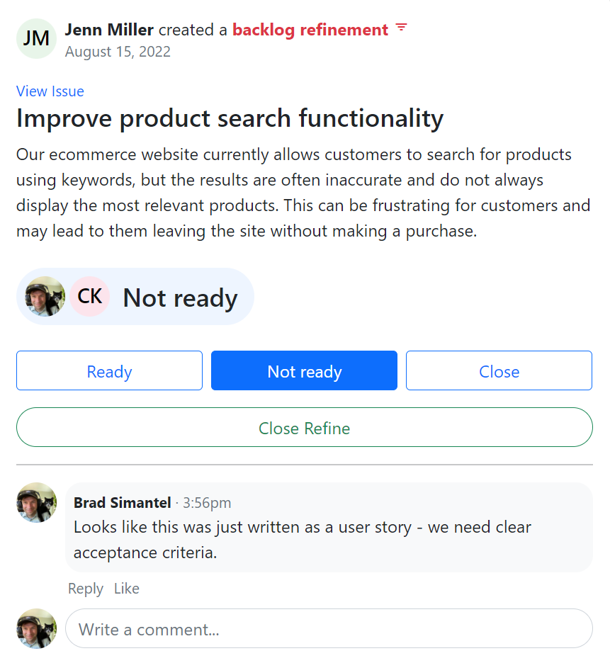 Finally, make sure your whole team is involved in the prioritization process. With Teaminal, this is as easy as starting a backlog refinement session where everyone can discuss acceptance criteria and priority, and vote on whether a task is ready to be scheduled.